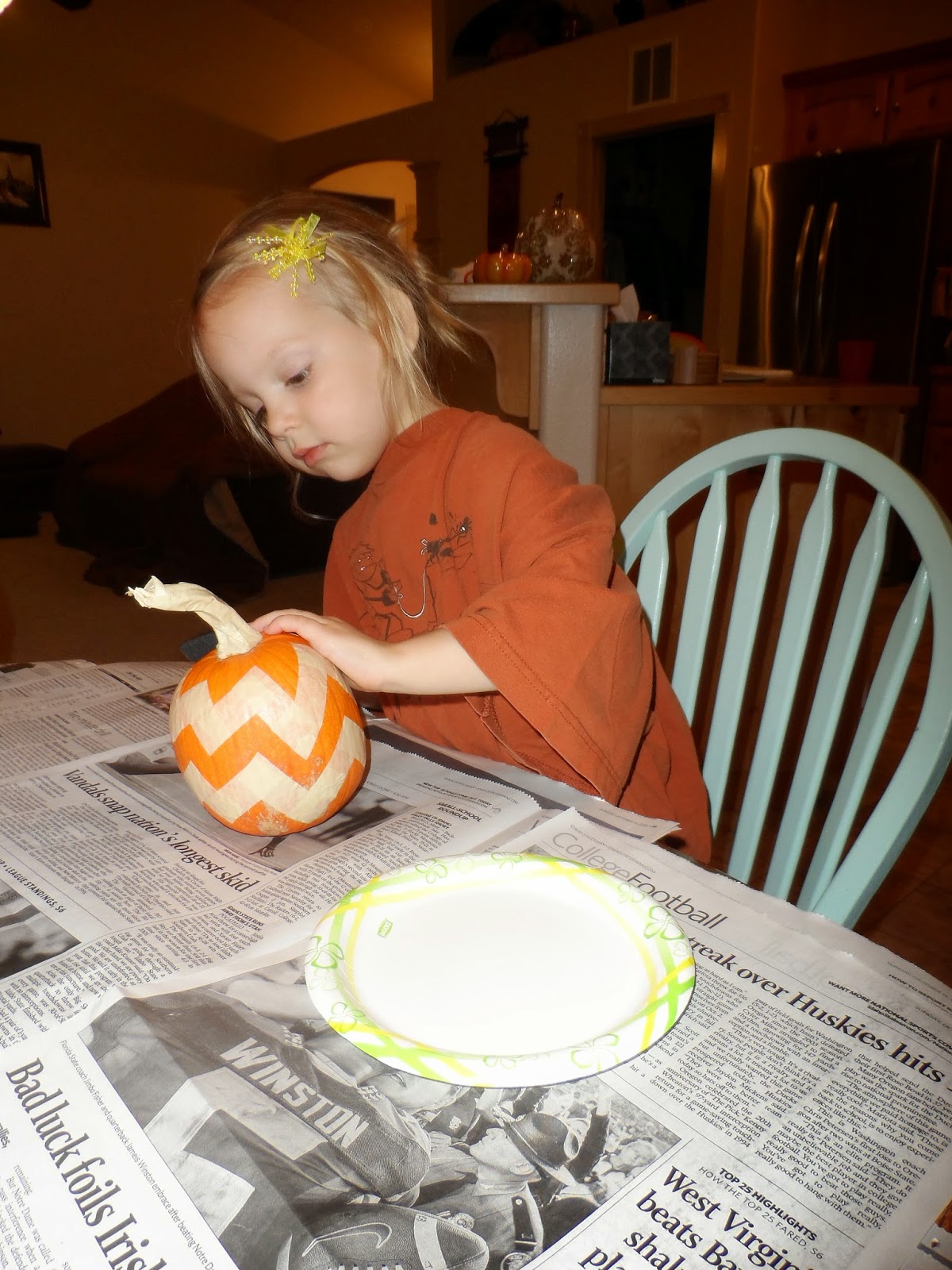 The next week for FHE we painted our pumpkins. For some strange reason Joe had never done this. I am certain that I have painted more pumpkins in my life than I have carved. It didn't exactly work out as I had envisioned but.. oh well. Joe outlined the letter B using a red pen....don't do that if you are painting with cream and glitter. And I taped a chevron pattern on Michelle's with masking tape so that she could just go to town painting and I could still get a pretty cute pumpkin out of it :) good idea but I must have bought the wrong paint because it wanted to peel right off of the pumpkin- I don't remember that problem growing up.